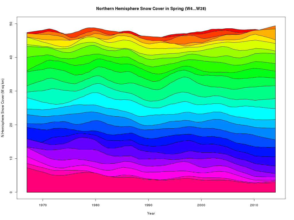 Here is the Spring snowfall (by week), if anything maybe the trend is the other way around? Actually no clear trend either up or down.
