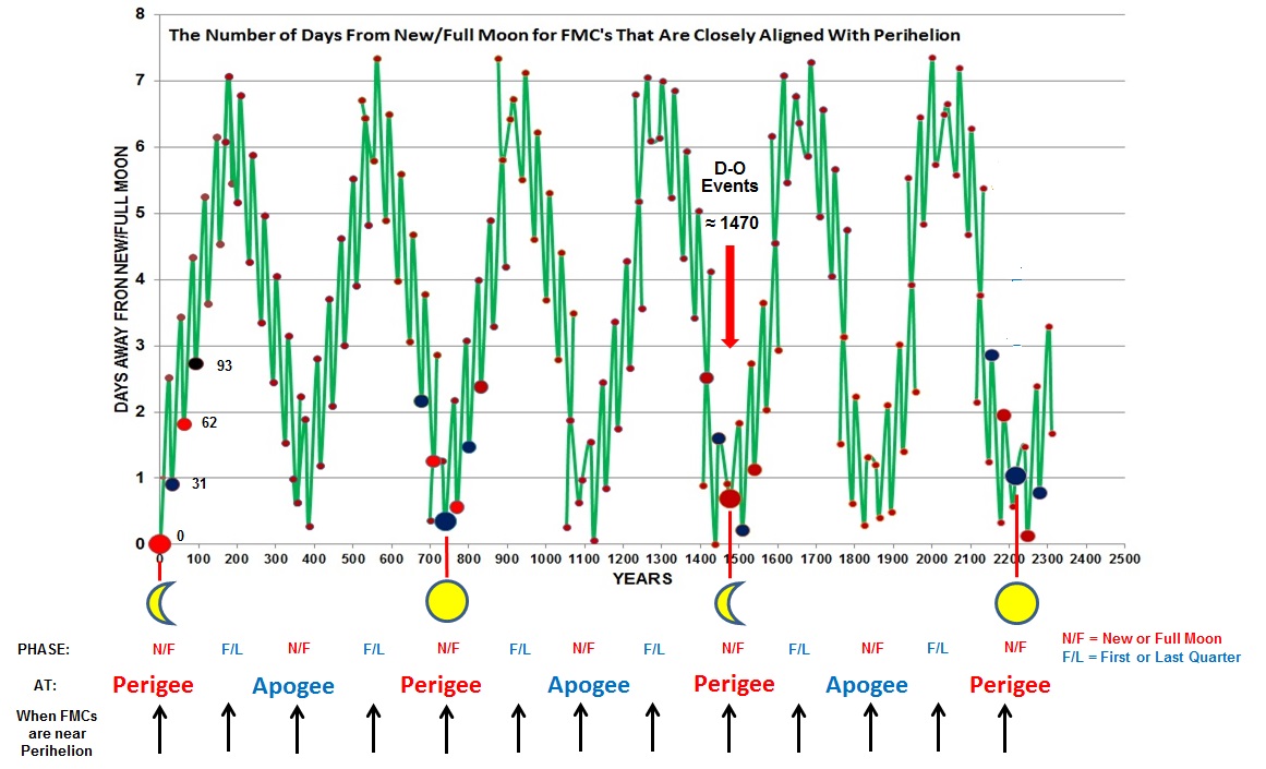 One Full Moon Cycle is the time required for the point of Perigee in the Lunar orbit to re-align with the Sun so the sun and the moon are pulling the oceans in the same direction. The strongest lunar tides occur when the Full Moon Cycle occurs at or very near to Perihelion This happens once every 177 years. These times are marked in the following diagram with vertical arrows.