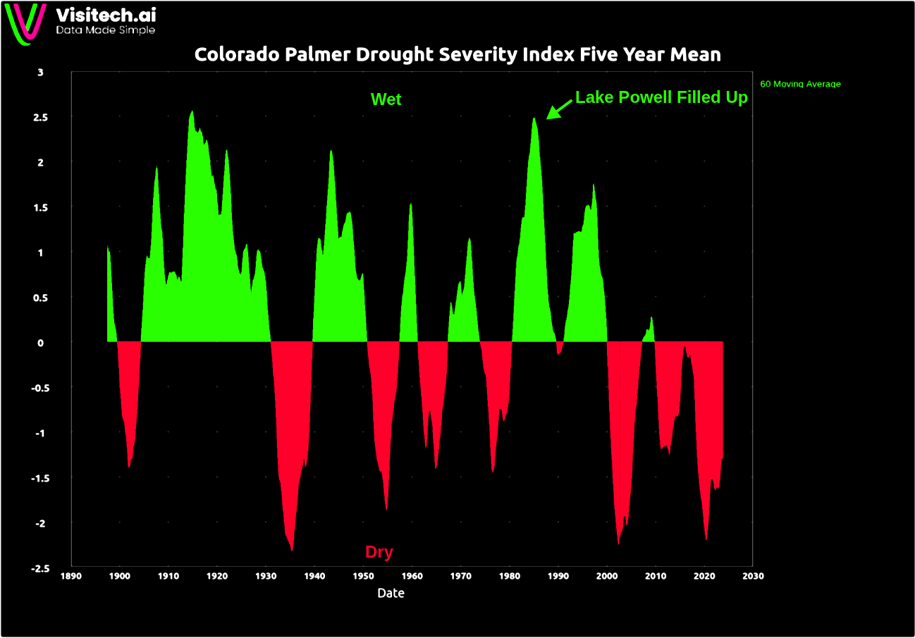 The Colorado River ran high during the very wet 1980s and 1990s, which allowed Lake Powell to fill up. But over the past three decades Colorado has been dry.